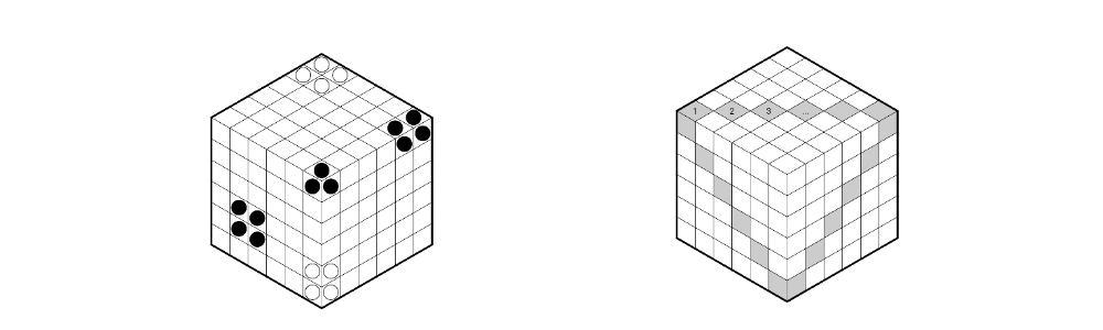 Trage in jedes Feld einen weißen oder einen schwarzen Kreis so ein, dass alle Kreise der selben Farbe horizontal und vertikal verbunden sind und weder ein 2x2-Bereich noch der 3er-Bereich in der Mitte komplett mit Kreisen einer Farbe gefüllt ist.