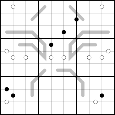 - Palindromes: There are some grey lines shown in the grid. The digits on these lines form a palindrome, that is, they read the same forwards and backwards e.g. 1234321
