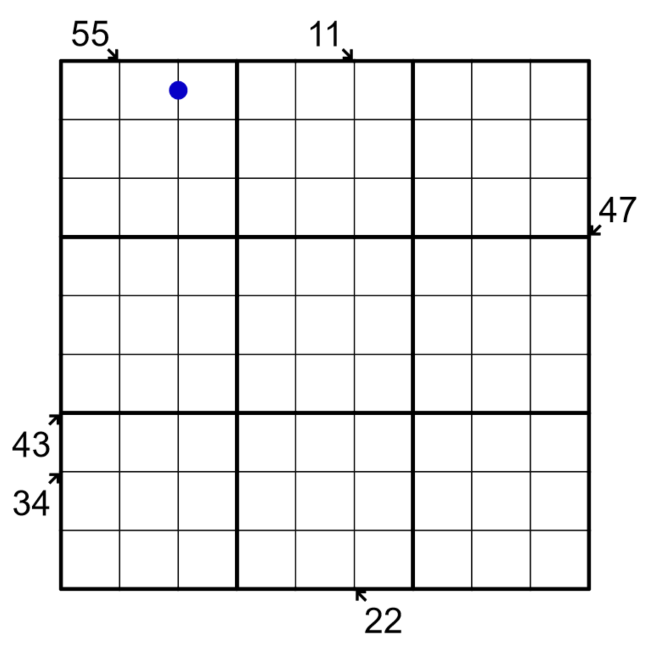 3) Little Killer clues show the sum of the digits along the indicated diagonal, which may contain repeats.