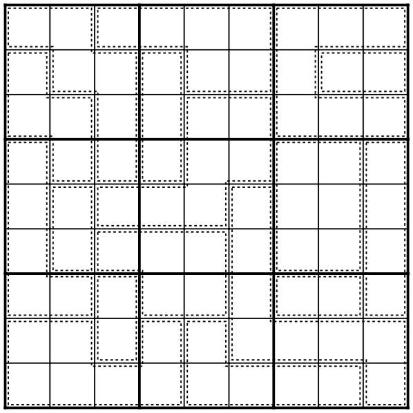 After publishing 4-color killer sudoku #1, I became obsessed with trying to find such a puzzle that has a unique solution without any given digits. It took a lot of time and effort, but I finally found one. Unfortunately I couldn't see how to solve it without bifurcating. But after testing a few slight variations of that, I came up with the puzzle above, which I think is a bit easier than the previous one.