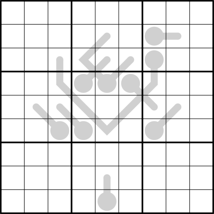 Rules: all standard sudoku rules apply. Digits on thermometers are strictly increasing from the bulb to the tip. Digits a chess knight's move apart cannot contain identical digits.