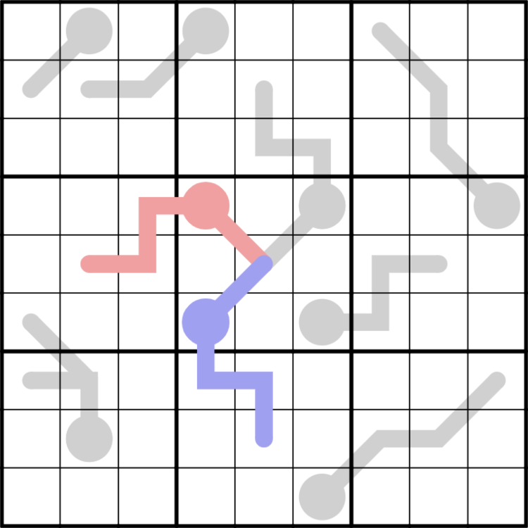 Regeln: Es gelten alle Standard-Sudoku-Regeln. Die Ziffern auf Thermometern nehmen von der Glühlampe bis zur Spitze stark zu. In diesem Puzzle sind einige Thermometer unterschiedlich gefärbt. Dies dient nur zur Unterscheidung von anderen Thermometern und hat keinen Einfluss auf das Puzzle.