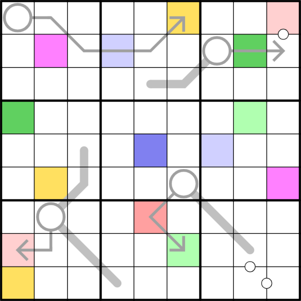 Jedes gleichfarbige Quadrat enthält dieselbe Ziffer. Jede Farbe enthält eine andere Ziffer als alle anderen Farben.