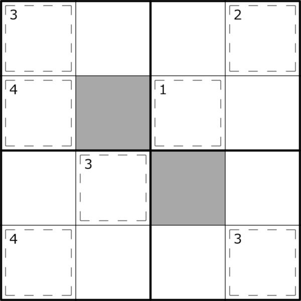 Ich experimentiere mit dieser neuen Art von Einschränkung, und da es eine sehr schwer einzustellende Variante ist, dachte ich, ich sollte mit einem 4x4 beginnen. Ich muss Trevor Tao und seiner / ihrer Sudoku-Variante "Order is Important" danken die Inspiration, die beweist, dass Zeit / Reihenfolge der Schritte bei Sudoku-Varianten eine Rolle spielen können.