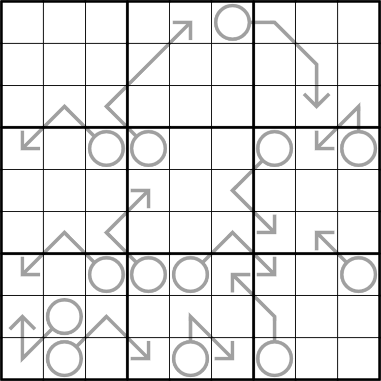 Digits on arrows sum to the digit in their circled cell. Digits MUST repeat on arrows if allowed by other rules. In other words, arrows which cross boxes have repeated digits ALWAYS.