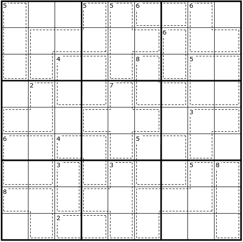 Die kleinen Ziffern in der linken oberen Ecke jedes gestrichelt umrandeten Gebietes geben den Median der Ziffern des Gebietes an. Der Median ist die mittlere Ziffer in einer ansteigend sortierten Menge (z.B. 2 für 1,2,8) oder der Durchschnitt der beiden mittleren Ziffern, falls die Menge aus einer geraden Anzahl von Ziffern besteht (z.B. 3 für 1,2,4,9). Innerhalb eines umrandeten Gebietes müssen alle Ziffern verschieden sein.