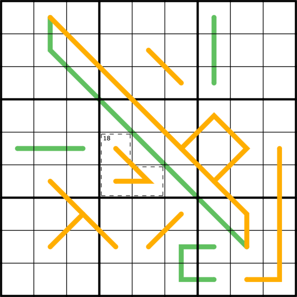 - Dutch Whisper: Benachbarte Ziffern auf der orangen Linie haben eine Differenz von mindestens 4. Ziffern können sich auf der Linie wiederholen, sofern die übligen Regeln dies zulassen.