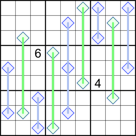 Numbers along a lockout line must not be between or equal to the numbers in the diamond ends.. Diamond values must differ by 4 or more for any segment.