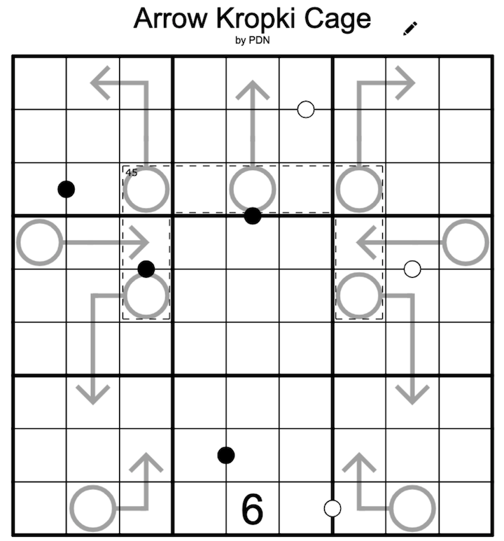Es gelten die normalen Sudoku-Regeln. Ziffern entlang eines Pfeils müssen sich zu der Ziffer im großen Kreis an seinem Ende summieren. Benachbarte Ziffern, die mit einem weißen Kropki-Punkt gekennzeichnet sind, sind fortlaufend. Benachbarte Ziffern, die mit einem schwarzen Kropki-Punkt markiert sind, haben ein Verhältnis von 2 zu 1. Nicht alle Punkte sind gegeben. Ziffern in einem Käfig müssen sich zu der kleinen Zahl oben links summieren und dürfen sich im Käfig nicht wiederholen. Ich denke, dieses Puzzle hat für viele Löser 2 von 5 Sternen für den Schwierigkeitsgrad. Kommentare wie immer erwünscht!