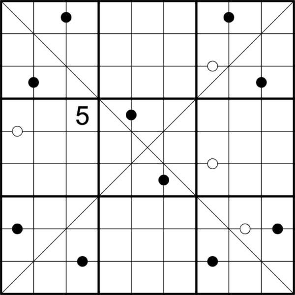 Normal Sudoku rules apply. Digits must not repeat in cells along the two (marked) principal diagonals. Digits in cells separated by a black dot must have a ratio of 2:1. Digits in cells separated by a white dot must be consecutive. Not all dots are necessarily given.