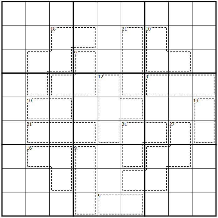 Digits inside a cage may not repeat and must sum to the small number in the top left corner.