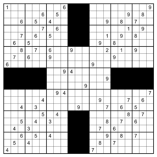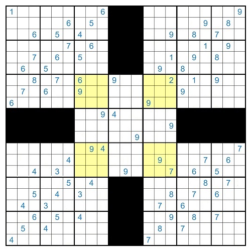 - Cells separated by a knight's move or king's move (in chess) cannot contain the same digit.