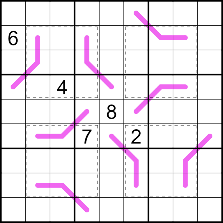 - Digits along a pink renban line must be distinct consecutive digits in any order.