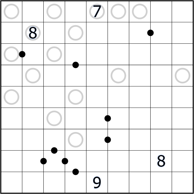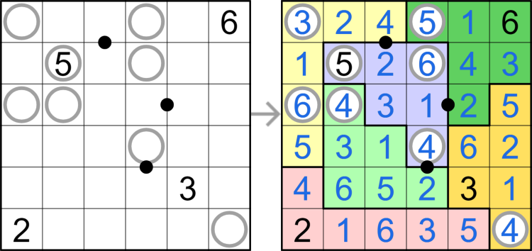 - Circled digits are the sum of the digits within the same region in the adjacent surrounding 8 cells. All such circles are given.