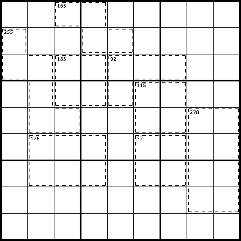 Giant Killers: In cages digits may not repeat. Digits in a cage are grouped into pairs of adjacent cells - each cell used exactly once. Each pair is a two-digit number, read left to right or top to bottom. The sum of the two digit numbers is given in the upper left corner of the cage.