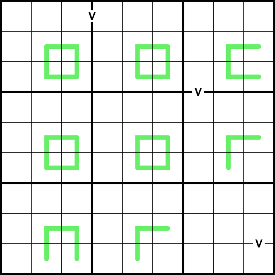 Digits separated by a 'V' sum to 5, not all Vs are given.