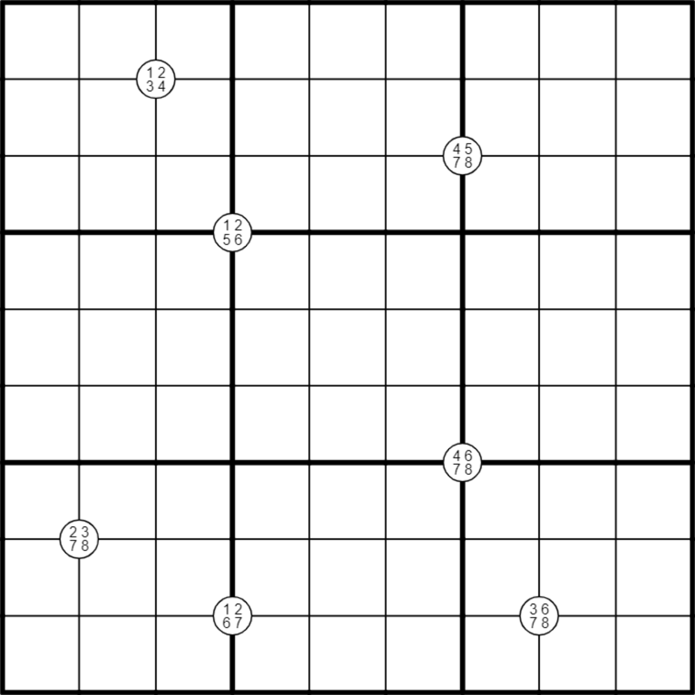 Das Puzzle ist Teil einer Serie von "Nerd-snipe"-Konstruktionen, die ursprünglich auf dem CTC-Fan-Discord-Server veröffentlicht wurden. Im Februar hatte ich ein Rätsel mit nur acht Quadrupeln gefunden (Cornucopia), vermutete aber, dass es auch mit sieben möglich sein könnte. Road Trip von jovi_al, bei dem weniger restriktive 2x2 Killer-Käfige anstelle von Quadrupeln verwendet werden, inspirierte mich zu einem erneuten Versuch und ich konnte dieses Puzzle konstruieren. Es hat ein ähnliches Layout wie Road Trip - sechs der Quadrupel befinden sich an denselben Stellen wie ihre Käfig-Pendants - aber die beiden Rätsel lösen sich ganz unterschiedlich. Probiert "Road Trip" aus, falls ihr es noch nicht kennt; es ist etwas schwieriger, aber der Lösungsweg ist großartig!