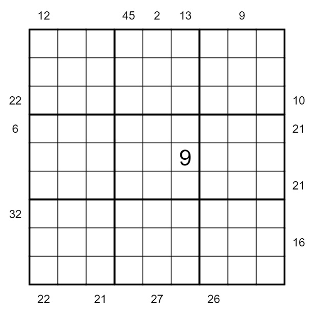 Normal sudoku rules apply. The clues outside the grid show the sum of the first X cells in that column or row with X being the first clue in one of the neighbouring rows or columns. For example, the clue in column 4, being 45, requires that the first digit in either column 3 or column 5 must be a 9. For clues in columns, the neighbour MUST be another column, and the same applies for rows (ie. corner clues must come from the same side). Cells can be the X clue for more than one neighbour.