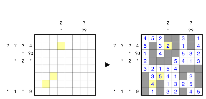 I'm assuming ?* denotes that the Japanese sum clue corresponds to exactly one digit in the grid? Is that a correct reading of the rule? The usage of "clue" here confused me but that might just be my inexperience.