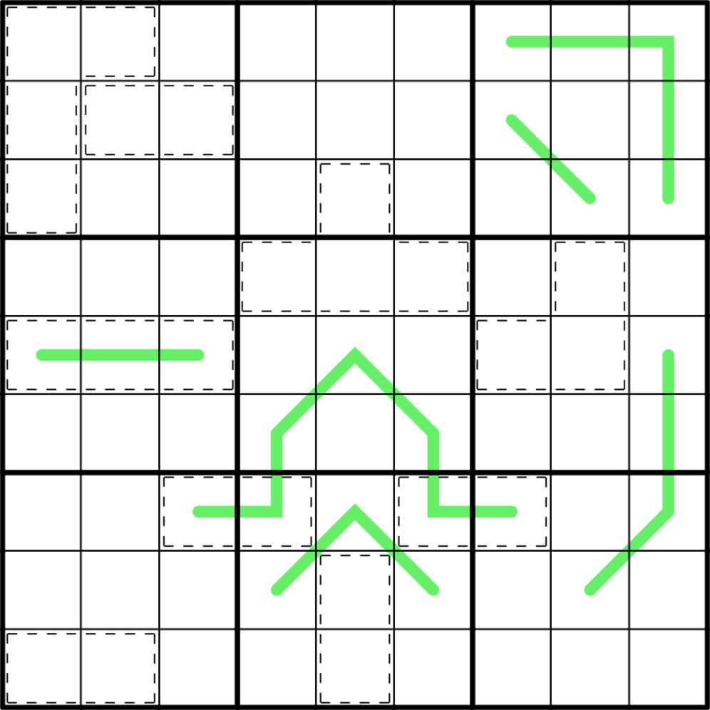 Killer cages: The digits in a cage sum to some number. In this puzzle, every cage has the same sum, which must be determined by the solver. Digits may not repeat in a cage.