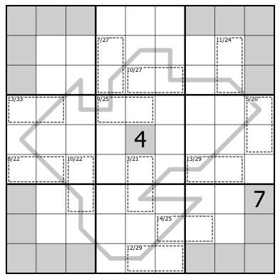 The grey line loops through all twelve pentominoes. It passes through exactly 2 cells of a pentomino before visiting the next. No digit on the line is greater than 5. Also, each pentomino contains one of the 2-cell cages, whose digits must sum to the first number in the top left corner.