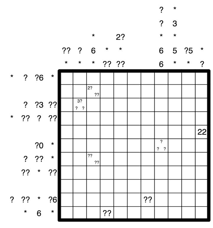 @Christounet yes that's right. It can represent no clues (so just shaded cells), one clue (either ? or ??) or several clues (some combination of ? & ??).