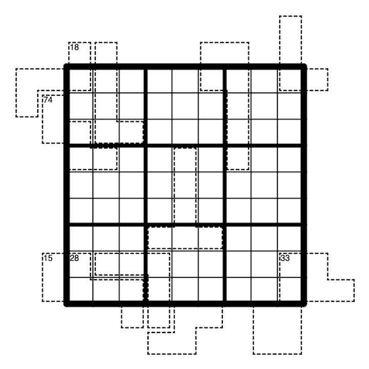An area outlined by dashes is called a killer cage, and the numbers in a killer cage must sum to the value in the top left corner. All individual digits in a killer cage must be different. A number in a killer cage outside the grid fulfills one of two possible clue types, and if two numbers outside a row or column on the same side of the grid are in killer cages, they are of different types. The types are as follows: