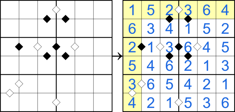 - Zellen über schwarzen Rauten haben ein Verhältnis von 1 zu die erste Ziffer (von links bzw. oben) in den jeweiligen Zeilen und Spalten.