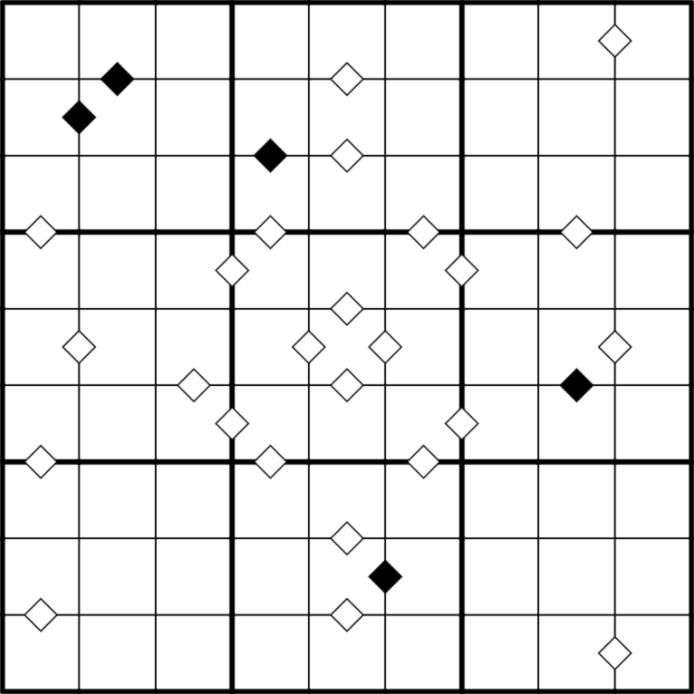 - Zellen über weißen Rauten haben einen Unterschied der ersten Ziffer (von links bzw. oben) in ihren jeweiligen Zeilen und Spalten.