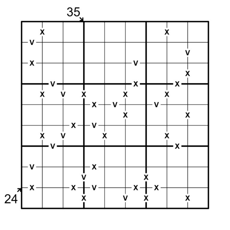Very nice puzzle, shame i had to use some bifurcation in the end to solve the puzzle. Rule 3 didnt provide me with an answer in this situation since both the X and the V would be correct. For the rest a lovely puzzle with a fun solving path.