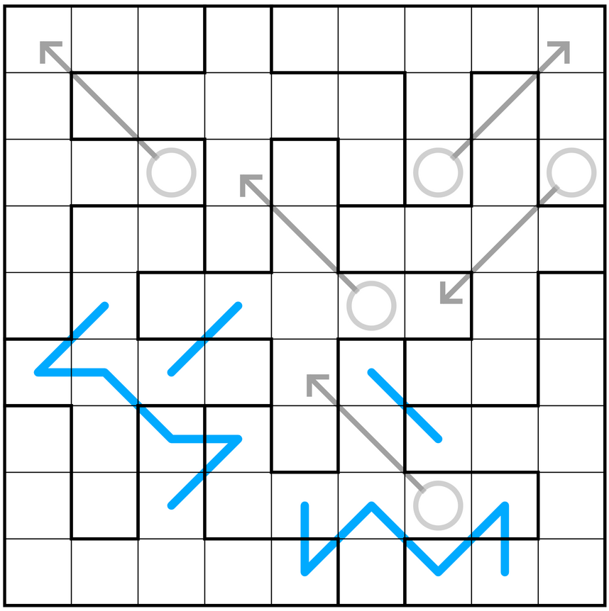 Normal irregular Sudoku. Standard Arrow rules and anti-Knight constraint. Blue lines are palindromes.