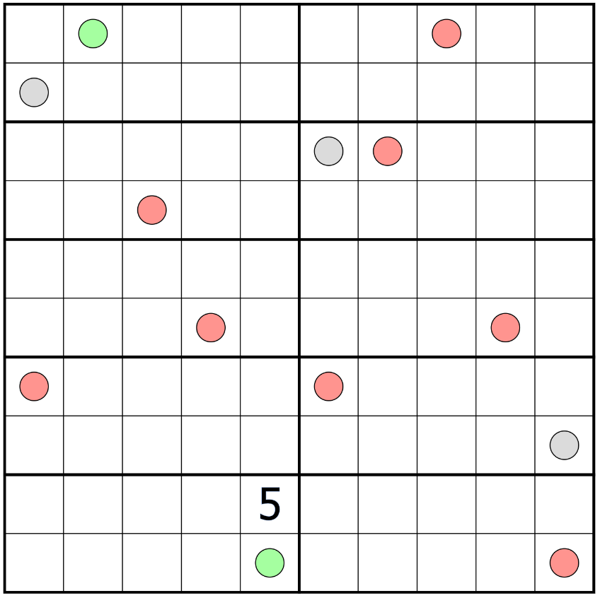 Place the digits 0–9 once each in every row, column, and box. Draw a non-intersecting loop through the centers of some cells which passes through each box exactly once. Orthogonally adjacent cells across a border may not both be unvisited by the loop. Adjacent digits on the loop differ by 5 or more. Digits in a gray, green, or red circle are odd. Digits in a green or red circle equal the number of cells visited by the loop in that box. Green circles are visited by the loop and red circles are not.