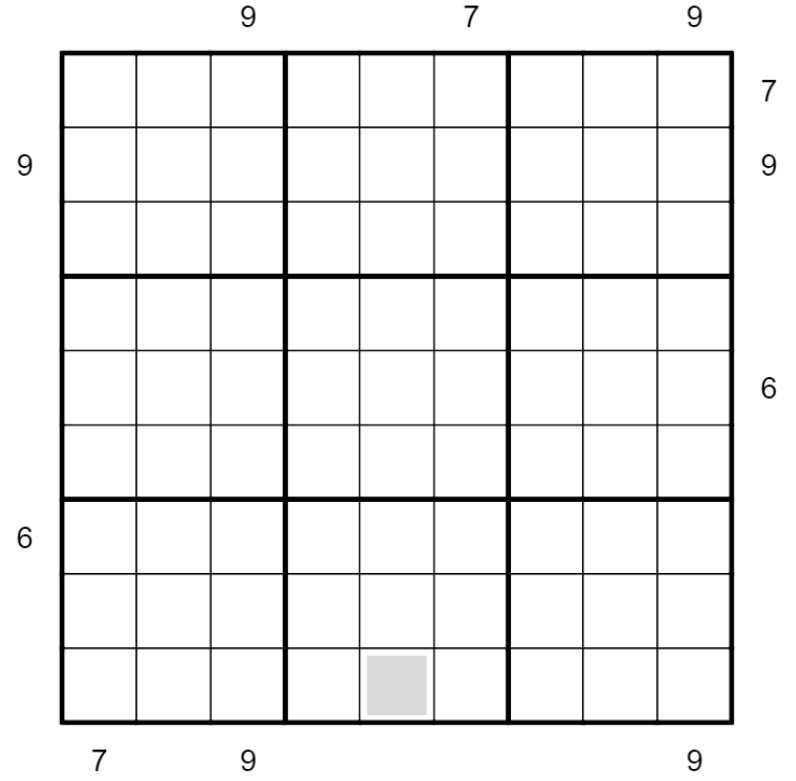 Clues outside the grid are skyscraper clues, but not the normal kind. A cell containing a digit D represents a skyscraper that is D units tall and occupies the entire cell (i.e. there is no space between adjacent skyscrapers). A clue outside the grid indicates the number of skyscrapers in that row or column that are visible from the perspective of a one-unit-tall person standing on top of the skyscraper closest to the clue (the skyscraper they are standing on is included in the count).