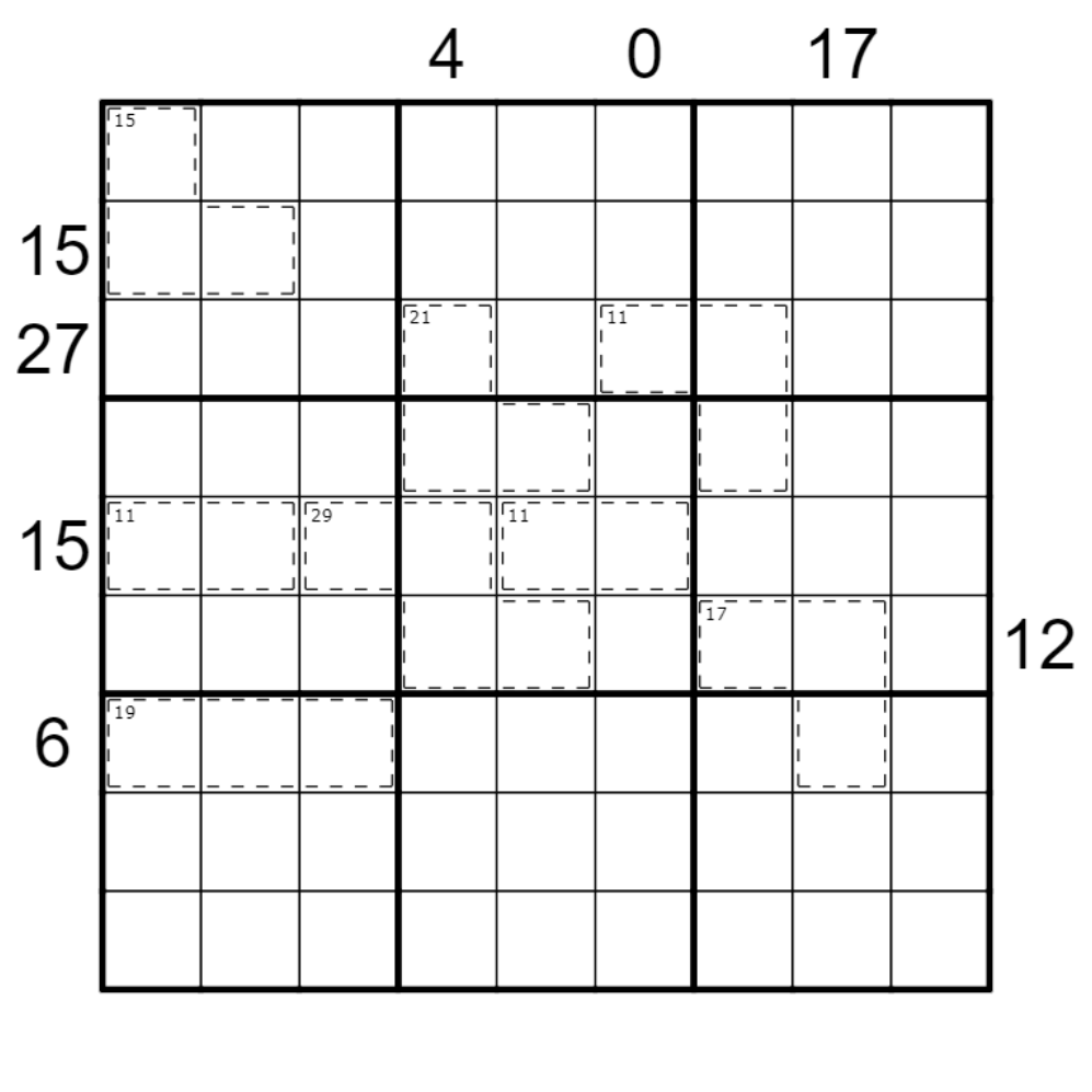 - Look-and-Say cages: Digits CAN repeat in these cages. The number in the top left corner should be read as a look-and-say number and says which digits are in that cage. For example, if a look-and-say cage has the clue "12" then it means there is one 2 in the cage. If it has the clue "33" then it means there are three 3s in the cage.