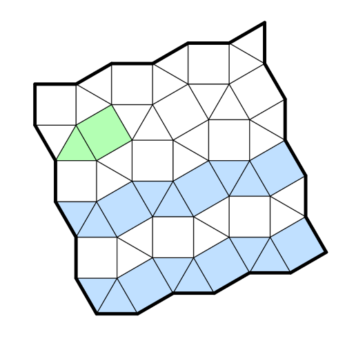 Fill the campsite with 12 regions of 8 cells with 1 tent in them. A region can not have 2 tents. (Important!) A digit in a triangle or square shows the amount of other regions touching that cell, apart from the region it is in itself. I've included a picture showing a tent (and tent rows). This particular combination of triangle and square is the only possible orientation of a tent. The tent rows are needed for the solution code. I've also included a picture of a smaller grid with 3 regions. Notice that all regions have just 1 tent. The tent rows for this mini campsite would give a 4251 solution code, 4 purple and 2 yellow on tent row 1, 5 green and 1 yellow on tent row 2