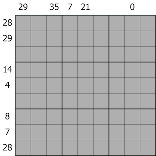 Numbers outside the grid indicate the sum of the digits between the 1 and 9 in that row or column. Digits separated by a white dot are consecutive.