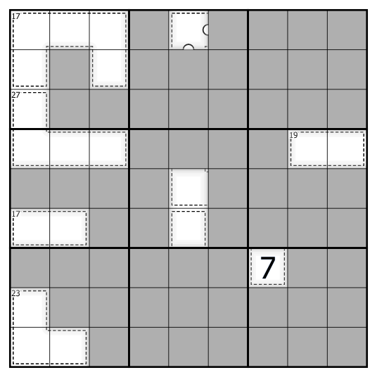 • No cage takes up a full 2x2 region of cells, and each cage has exactly one marked cage total (which is not necessarily in the top left corner of a cage).