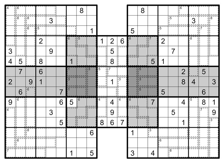 • Any two cells separated by a king's move (in chess) cannot contain the same digit unless permitted by gattai rules.
