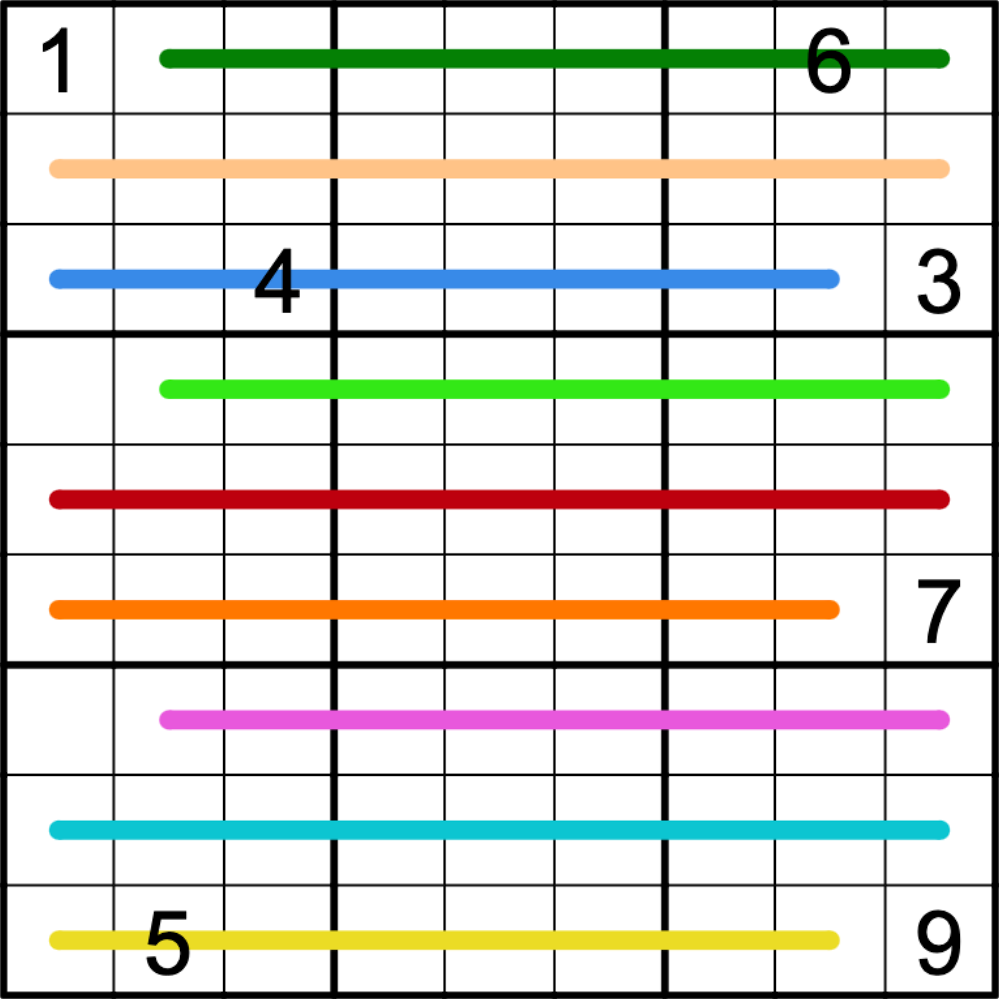 - Modular Line. Any set of 3 adjacent cells on this line must contain a digit from (147), a digit from (258) and a digit from (369).