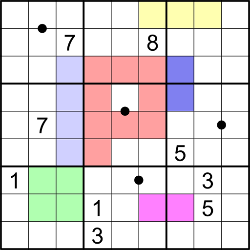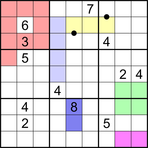 • (Kropki dots) digits separated by a black dot must be in a ratio of 2:1. Not all dots are necessarily given.