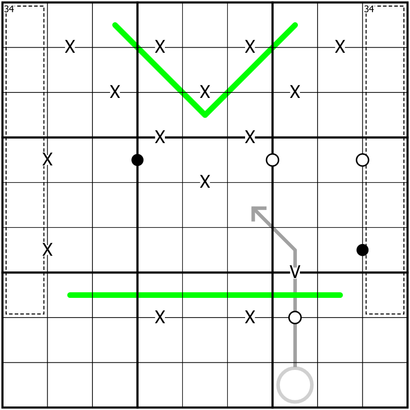 Cells joined by Vs sum to 5. Cells joined by Xs sum to 10. Not all Vs or Xs are given.