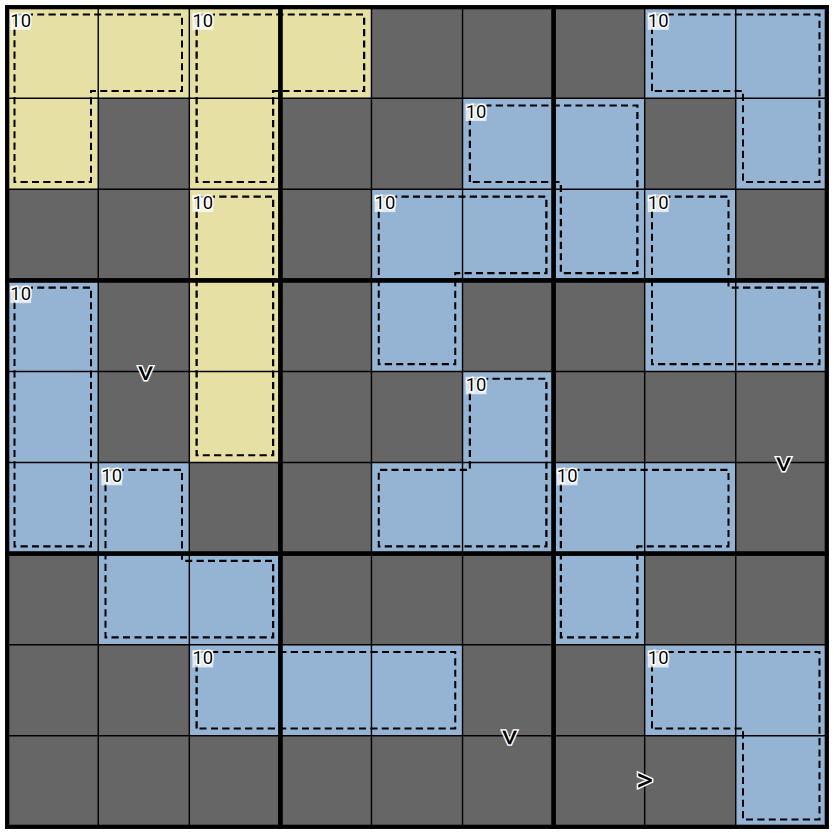 Maybe I shouldn't go to those lengths and just address the puzzle directly. But that would work better in a puzzle about four cages. Four cages that form a wall! You'd get colored 31 pairs all over the grid! Actual 31s could only be placed at the end, unless you're "break-in" the puzzle.