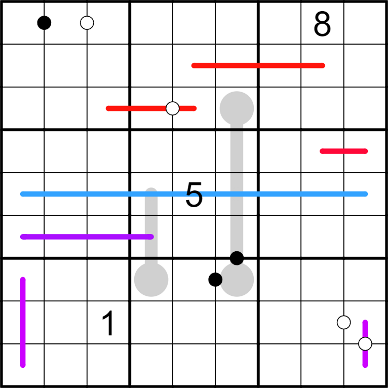 There are two sets of battleships, red and purple. The digits at the end of each battleship refer to the coordinates and sum of *deleted* their target. For example: if R7C1 is a 1 and R9C1 is a 4, the *target is* in either R1C4 or R4C1, and its value must be 5. *Each battleship is firing a single shot, and no ships share a target. The red ships are targeting the red circles (or the 3 central cells of the purple ships, i.e. r6c23 & r8c1), the purple ships are targeting the purple circles (or r2c67 & r3c4)*