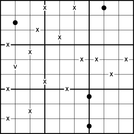 Normal Sudoku rules apply. Digits separated by a black dot must have a ratio of 1:2. Digits separated by an X must add to 10. Digits separated by a V must add to 5. Not all X's, V's, or black dots are necessarily given.