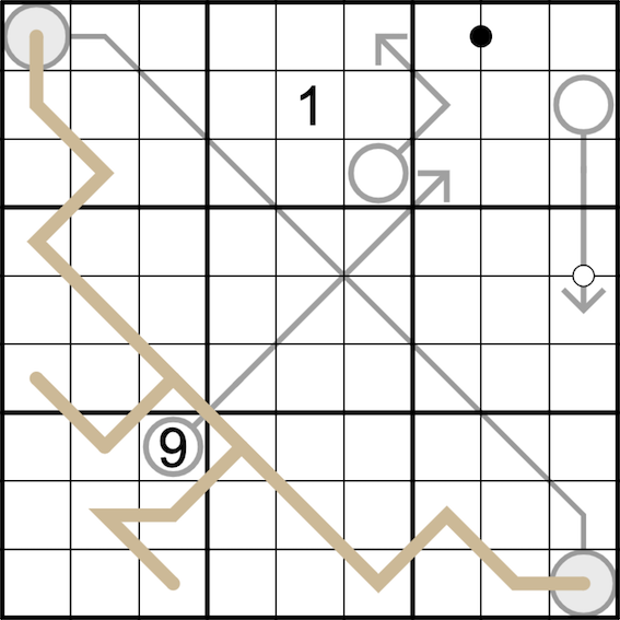- The thick line is a region sum line: along the line, digits have an equal sum N within each box passed through. If a line passes through the same box more than once, each individual segment of the line within that box sums to N separately