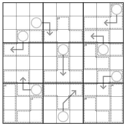 Digits in cages do not repeat and must sum to the small clue, if given.