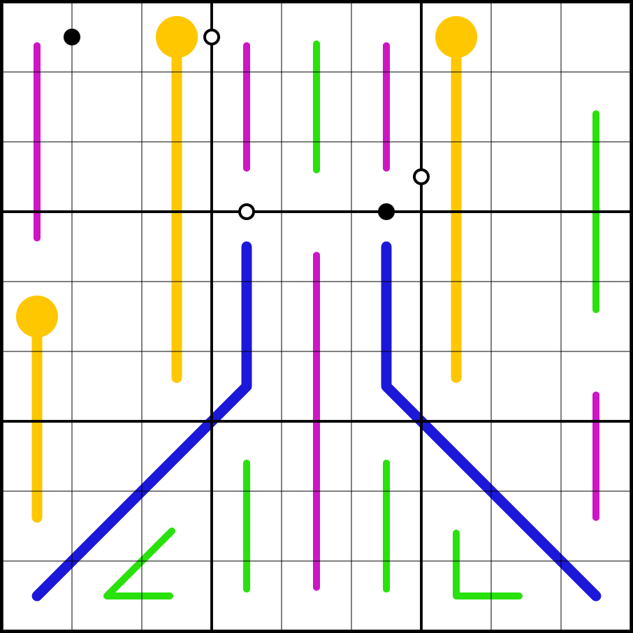• Digits along a blue palindrome line read the same forwards or backwards.