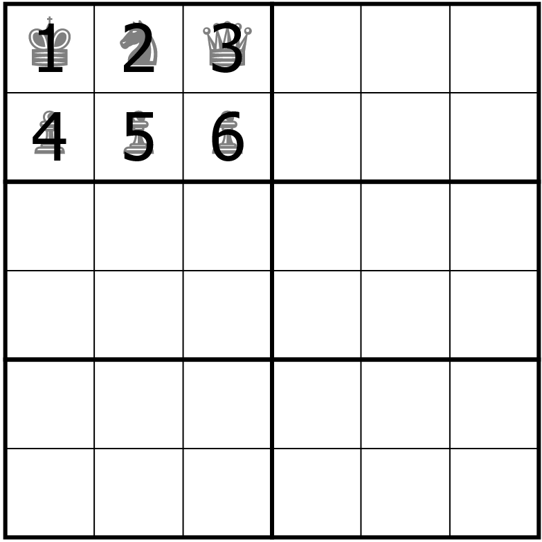 Standard 6x6 sudoku rules apply. Place the digits 1-6 once each into every row, column, or box. All instances of a digit found on a chess piece cannot be allowed to 'attack' the same digit, according to that piece's chess move constraints. (Digits on knights are anti-knight, digits on queens are anti-queen, digits on kings are anti-king, and black pawns attack diagonally downward.)
