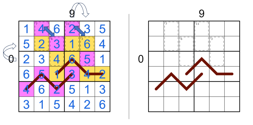 In the example image above arrows demonstrate the direction in which the cage/sandwich sum shifted. Cells colored in purple show the digits that "fell" from the cages onto the renban. Cells colored in yellow show the digits that "fell" onto the entropy line.