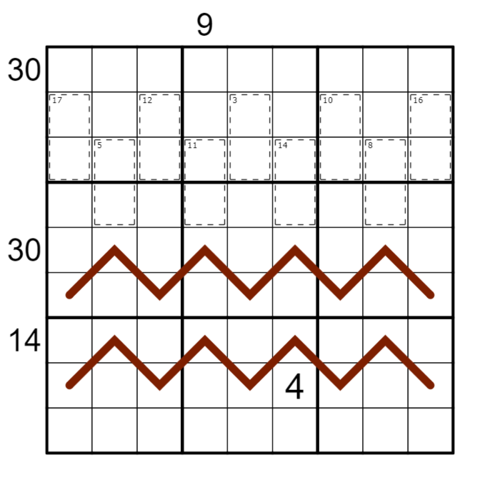 HOWEVER, an earthquake struck the grid. The earthquake covered both the renban and entropy lines with dirt. The earthquake also shifted the cages sum exactly one column to the left or to the right. For instance, a cage sum originally in column 1 may have shifted to column 2 or 9. Furthermore, exactly one digit from each cage fell onto the renban line and the other digit fell onto the entropy line (i.e. the 18 digits in the cages are the same digits that are on the lines, and each cage contributes one digit to each line). Additionally, The sandwich sum has been shifted exactly one row up or one row down, or one column left or one column right, depending on the context (row 1 clue can shift to row 2 or 9). It is up to the solver to deduce the nature of each line and determine the direction in which the cage/sandwich sum has shifted.